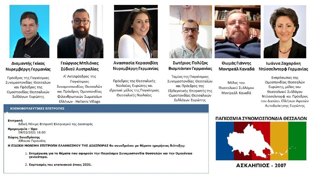 Η Παγκόσμια Συνομοσπονδία Θεσσαλών ήταν προσκεκλημένη από τον πρόεδρο της Ειδικής Μόνιμης Επιτροπής της Βουλής για θέματα του Απόδημου Ελληνισμού κ. Σάββα Αναστασιάδη στην πρώτη συνεδρίαση του έτους 2021, την Τρίτη 9 Φεβρουαρίου, που λόγω της πανδημίας πραγματοποιήθηκε μέσω τηλεδιάσκεψης.