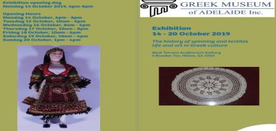 Το πρώτο Ελληνικό μουσείο στη Νότια Αυστραλία είναι γεγονός. Δημιουργήθηκε από ένα ζευγάρι νεομεταναστών,την εκπαιδευτικό Χρυσούλα Μελισσινάκη και τον Παναγιώτη Μαυραειδή . Στόχος του Μουσείου είναι να βγουν στην επιφάνεια οι μικροί ξεχασμένοι θησαυροί του Ελληνικού Πολιτισμού. Η πρόεδρος του Μουσείου, κυρία Μελισσινάκη μίλησε στη ΦΩΝΗ ΤΗΣ ΕΛΛΑΔΑΣ, στην εκπομπή “Κουβέντες μακρινές” και συγκεκριμένα στη δημοσιογράφο Νατάσα Βησσαρίωνος, για την προσπάθεια που άρχισε σαν μια ιδέα το 2012 και υλοποιείται αυτές τις ημέρες. Το Ελληνικό Μουσείο της Αδελαΐδας είναι πλέον ένας μη κερδοσκοπικός οργανισμός, που δεν κατέχει ακόμη μόνιμο χώρο στέγασης, αλλά εγκαινιάζει την πρώτη του έκθεση με τίτλο: “Ιστορία της κλωστής και του εργόχειρου. Ζωή και Τέχνη στον Ελληνικό Πολιτισμό” την Δευτέρα, 14 Οκτωβρίου, στην γκαλερί West Torrens Auditorium στην περιοχή Hilton της Αδελαΐδας. Πρόκειται για 40 καδραρισμένα εργόχειρα διαφορετικών τεχνοτροπιών από το 1900 έως σήμερα.