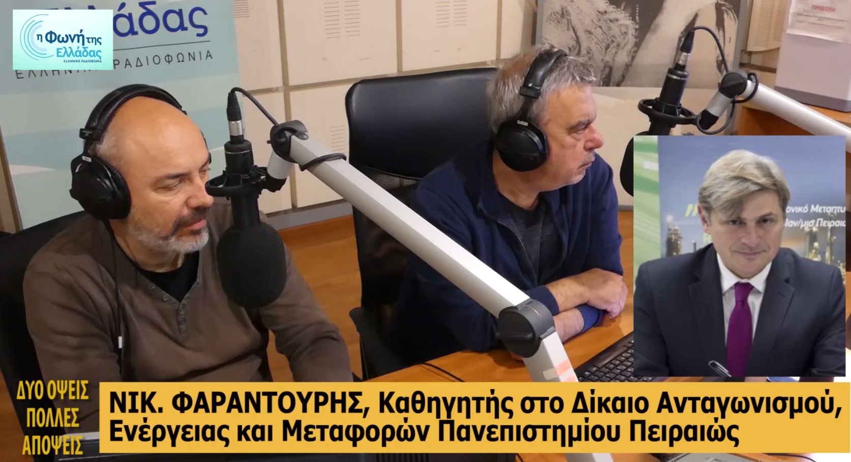Σε μια εξαιρετικά ενδιαφέρουσα συνέντευξη στους Χρήστο Παγώνη και Προκόπη Αγγελόπουλο, ο κ. Νίκος Φαραντούρης, καθηγητής της Ευρωπαϊκής Έδρας Jean Monnet στο Ευρωπαϊκό Δίκαιο Ανταγωνισμού, Ενέργειας και Μεταφορών και Διευθυντή του Μεταπτυχιακού Προγράμματος στη Στρατηγική, Δίκαιο & Οικονομικά της Ενέργειας στο Πανεπιστήμιο Πειραιώς, ανέλυσε τις στρεβλώσεις που υπάρχουν στην Αγορά Ενέργειας, τον τρόπο με τον οποίο οι Οικονομίες θα πρέπει να αντιμετωπίσουν τη μάστιγα των ολιγοπωλείων, με στόχο την εξυπηρέτηση των Ευρωπαίων πολιτών-καταναλωτών, που επιβάλλεται να έχουν πρόσβαση στο Δημόσιο Αγαθό της Ενέργειας, ανεμπόδιστα. Ανέλυσε τα δεδομένα που διαμορφώνει στην Αγορά η ρήτρα αναπροσαρμογής που, όπως τόνισε, έχει κριθεί καταχρηστική σύμφωνα με πρόσφατη δικαστική απόφαση. Έδωσε, επίσης, το στίγμα της Παγκόσμιας Οικονομικής συγκυρίας των τελευταίων χρόνων που, όπως είπε χαρακτηριστικά, θυμίζει την περίοδο του Μεσοπολέμου με έντονα φαινόμενα προστατευτισμού, συγκέντρωση πλούτου και κοινωνικές ανισότητες, επισήμανε, ωστόσο, πόσο σημαντικό είναι, εδώ και τώρα, να ασκηθούν σοβαρές δημόσιες πολιτικές για την αντιμετώπιση της Κρίσης, οικονομικής και κοινωνικής. “Την Ενέργεια, το Νερό και την υγεία αν την αφήσεις ανεξέλεγκτη απλά δεν θα την έχεις” καταλήγει ο κ. Φαραντούρης, δίνοντας το στίγμα μιας πολιτικής στη διαχείριση των δημοσίων αγαθών που θα πρέπει να μπει στο κάδρο, τα επόμενα χρόνια, στην οικονομική πολιτική των μελών της Ε.Ε.