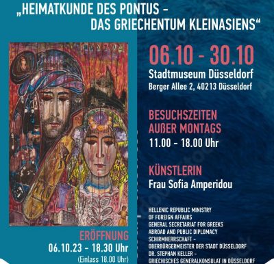 Στην εκπομπή την Τετάρτη 18 Οκτωβρίου, φιλοξενήθηκε ο πρόεδρος του Συλλόγου Ελλήνων Ποντίων Ντίσελντορφ ¨Ο Ξενητέας” κ. Ηλίας Μαυρίδης και η εικαστικός Σοφία Αμπερίδου από τη Θεσσαλονίκη με αφορμή την επετειακή έκθεση για τα 40 χρόνια από την ίδρυση του “Ξενητέα” που παρουσιάζεται αυτές τις ημέρες στο μουσείο της πόλης του Ντίσελντορφ. Πρόκειται για την έκθεση «Πατριδογνωσία Πόντου – Η Ρωμιοσύνη της Ανατολής» της εικαστικού Σοφίας Αμπερίδου που θα φιλοξενείται στο μουσείο έως τις 30 Οκτωβρίου. Η έκθεση πραγματοποιείται υπό την αιγίδα της Γενικής Γραμματείας Απόδημου Ελληνισμού και Δημόσιας Διπλωματίας, του Γενικού Προξενείου της Ελλάδας στο Ντίσελντορφ και του δημάρχου της πόλης Stephan Keller και είναι η πρώτη ατομική έκθεση της εικαστικού στο εξωτερικό.