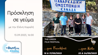 Η Πρόεδρος της Παναρκαδικής Ομοσπονδίας Καναδά Νότα Ηλιοπούλου και η Διευθύντρια του Greek Film Festival in Berlin Σοφία Σταυριανίδου ήταν καλεσμένες της Ελένης Καραλή στην εκπομπή «Πρόσκληση σε γεύμα» της Φωνής της Ελλάδας την Τετάρτη 13 Σεπτεμβρίου 2023 στις 16:00.