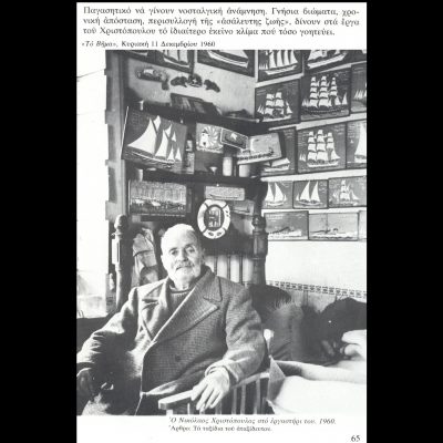 “Ο Νικόλαος Χριστόπουλος γεννημένος το 1880, δουλεύει, από 8 χρονών, στον οικογενειακό ταρσανά που ίδρυσε ο πατέρας του και εκεί περνά όλη του τη ζωή. Δεν μετακινείται και συνεπώς δε γνωρίζει το γύρω τοπίο πέρα από τα Πευκάκια. Δεν είναι λάτρης μόνο του υγρού στοιχείου, είναι ο καραβομαραγκός, που όλη του τη ζωή την έχει περάσει στο καρνάγιο.” Ο Κίτσος Μακρής στο βιβλίο του ”Νικόλαος Χριστόπουλος, ο ζωγράφος του ταρσανά”, τον αποκαλεί ”αταξείδευτο”.