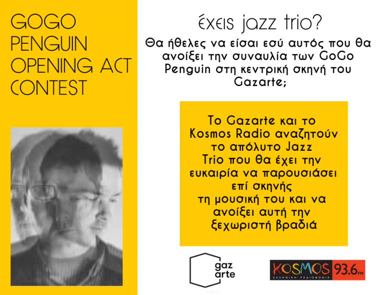 Στα πλαίσια της μοναδικής εμφάνισης των GoGo Penguin, την Παρασκευή 12 Απριλίου, το Gazarte και το Kosmos Radio αναζητούν το απόλυτο Jazz Trio που θα έχει την ευκαιρία να παρουσιάσει επί σκηνής
