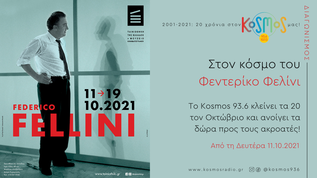 Από τη Δευτέρα 11 Οκτωβρίου το Kosmos θα προσφέρει στους ακροατές του καθημερινά διπλές προσκλήσεις για όλες τις προβολές του μεγάλου αφιερώματος στον μεγάλο Ιταλό maestro. Αλλά ταυτοχρόνως το αφιέρωμα είναι μία ευκαιρία να μιλήσουμε ξανά για τις ταινίες του Φελίνι. Για τη ζωή του. Για τα όνειρα και τις εμμονές που χαρακτήρισαν το έργο του. Και, φυσικά, να ακούσουμε μουσικές που τις συνόδευσαν ξεκινώντας την Κυριακή 10 Οκτωβρίου στις 11 το πρωί στην εκπομπή της Γιώτας Κοτσέτα, μ’ ένα ωριαίο αφιέρωμα στον μεγάλο Ιταλό σκηνοθέτη με τα 4 Όσκαρ.