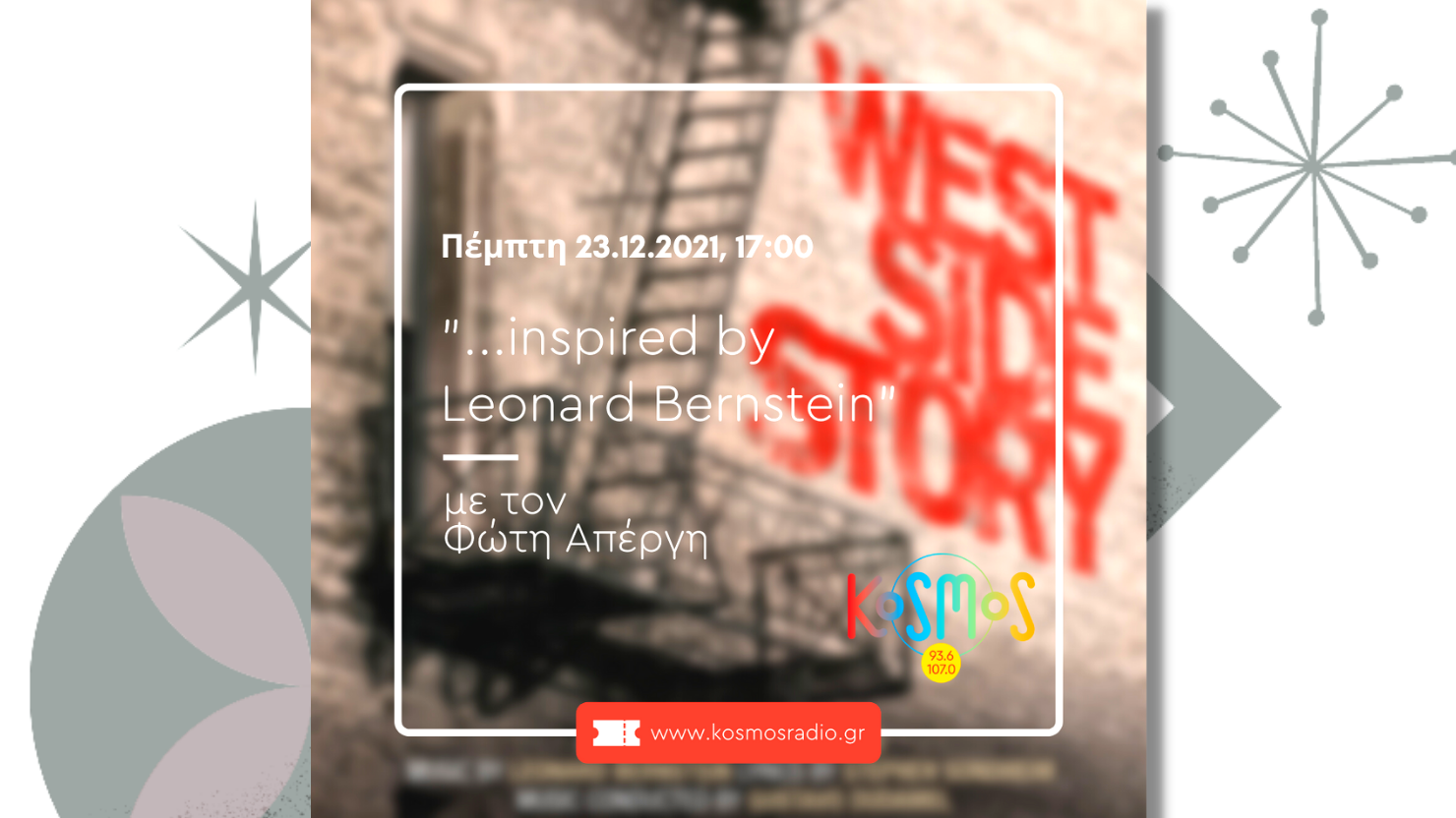Την Πέμπτη 23 Δεκεμβρίου στις 5 το απόγευμα και με αφορμή τη νέα ταινία του Στίβεν Σπίλμπεργκ, «West Side Story», ο Φώτης Απέργης παρουσιάζει τις πιο ετερόκλητες εκδοχές τραγουδιών του Λέοναρντ Μπέρνσταϊν, που ερμηνεύουν από σταρ του Χόλιγουντ έως τραγουδιστές της όπερας και ράπερ. Με όλες τις συναρπαστικές λεπτομέρειες του περίφημου μουσικού έργου, από τη θεατρική πρεμιέρα του 1957 μέχρι τη νέα κινηματογραφική εκδοχή του.