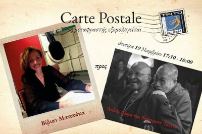 19ΝΟΕ2018  “Carte Postale – Ένας μεταφραστής εξομολογείται” Βίβιαν Ματσούκα προς Δαλάι Λάμα και Ντέσμοντ Τούτου”.