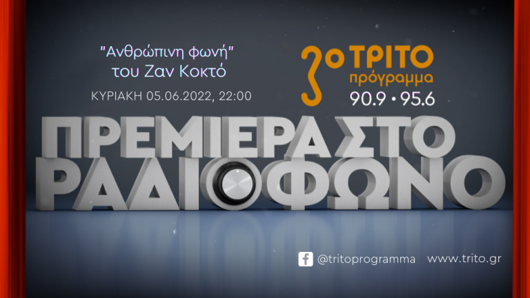 Ακόμα μία ραδιοφωνική πρεμιέρα θα απολαύσουν οι ακροατές στην εκπομπή «Το Θέατρο της Κυριακής στο Τρίτο», στο πλαίσιο των νέων θεατρικών ηχογραφήσεων της Ελληνικής Ραδιοφωνίας. Την Κυριακή 5 Ιουνίου 2022, στις 22:00, το Τρίτο Πρόγραμμα μεταδίδει το κλασικό έργο του Ζαν Κοκτώ, «Ανθρώπινη φωνή».